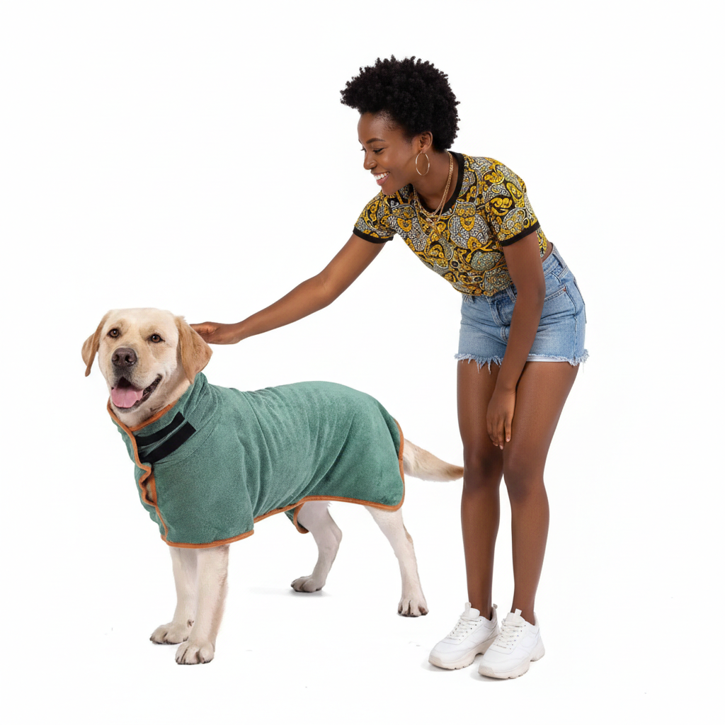The Quick Dry Pet Bathrobe is a premium nanofibre bath towel and full-body wrap specially designed for dogs and cats. Made from ultra-soft, high-absorbency nanofibre material, this bathrobe wraps your pet completely after a bath or outdoor walk in the rain — soaking up moisture fast and keeping your pet warm and comfortable while they dry. Available in green and grey, it is suitable for all breeds and sizes from small to large dogs.