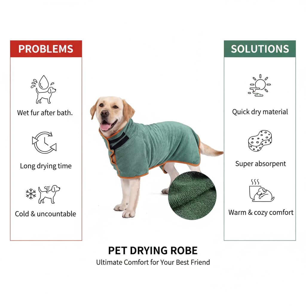 Drying your pet after a bath can be a messy, time-consuming struggle. Regular towels absorb poorly, leave your pet damp for too long, and spread wet fur and water all over your home. Keeping a wet pet still long enough to dry them is frustrating for both owner and animal. The Quick Dry Pet Bathrobe wraps your pet securely in one simple motion, absorbing water rapidly so bath time becomes faster, easier, and stress-free for everyone.